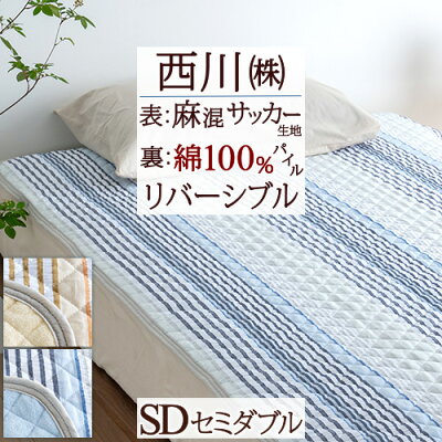 敷きパッド セミダブル 麻混 西川 春 夏 秋 冬 オールシーズン 両面使える リバーシブル 西川リビング パイル サッカー生地 敷きパット 両面 敷パッド ベッドパッド